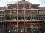 Installing the scaffolding correctly threw up a number of challenges, one of which involved deviating from the original design to allow the scaffold to have acceptable clearance on the higher portion of the plinth that runs around the building. The buttress standard is subject to compressive loadings; standards requiring lapped joints are the standard forming the independent. After liaising closely with the contractors, we added further check fittings which were photographed for the contractor's approval.